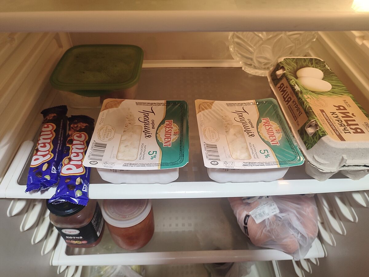У меня тоже так. Йогурты,сырочки, молоко,фрукты,сыр сметают дети, я покупаю всегда свежее мясо и из него готовлю. А картошка, лук,буряк итд не хранятся в холодильнике. Консервы,крупы стоят отдельно