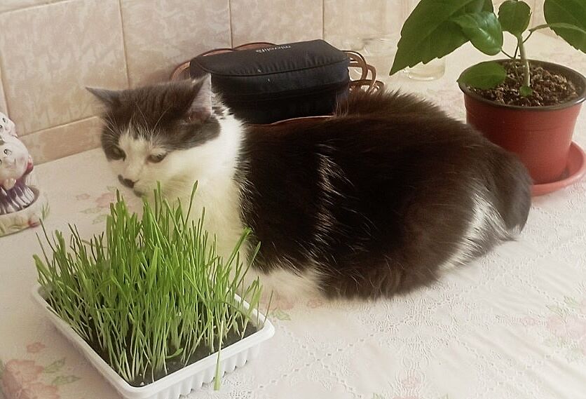 Ела, потом посадили ей специальную траву для котиков, это овес или пшеница, точно не помню. Она очень ее любит