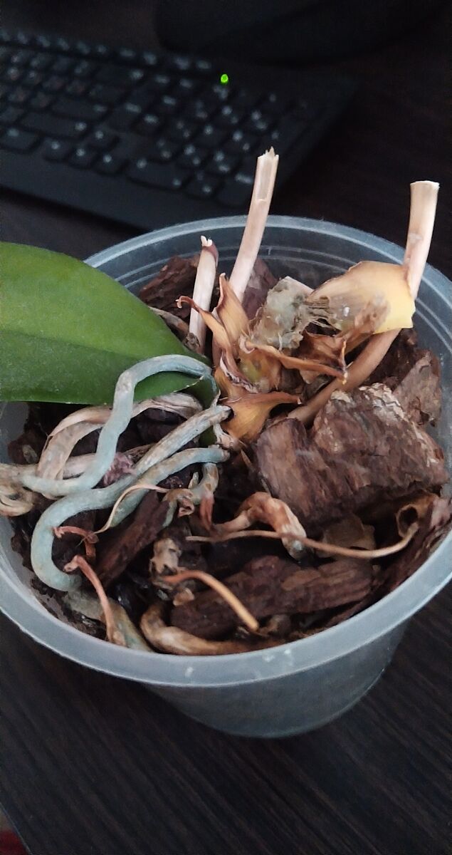 Можна поливати і чекати дітку. Поливають менше, ніж орхи з листям. Але хто його знає, як ви поливали до того. Підозрюю, що мало). Поки чекаєте дітку, читати групу, ссилку на яку вам дали.