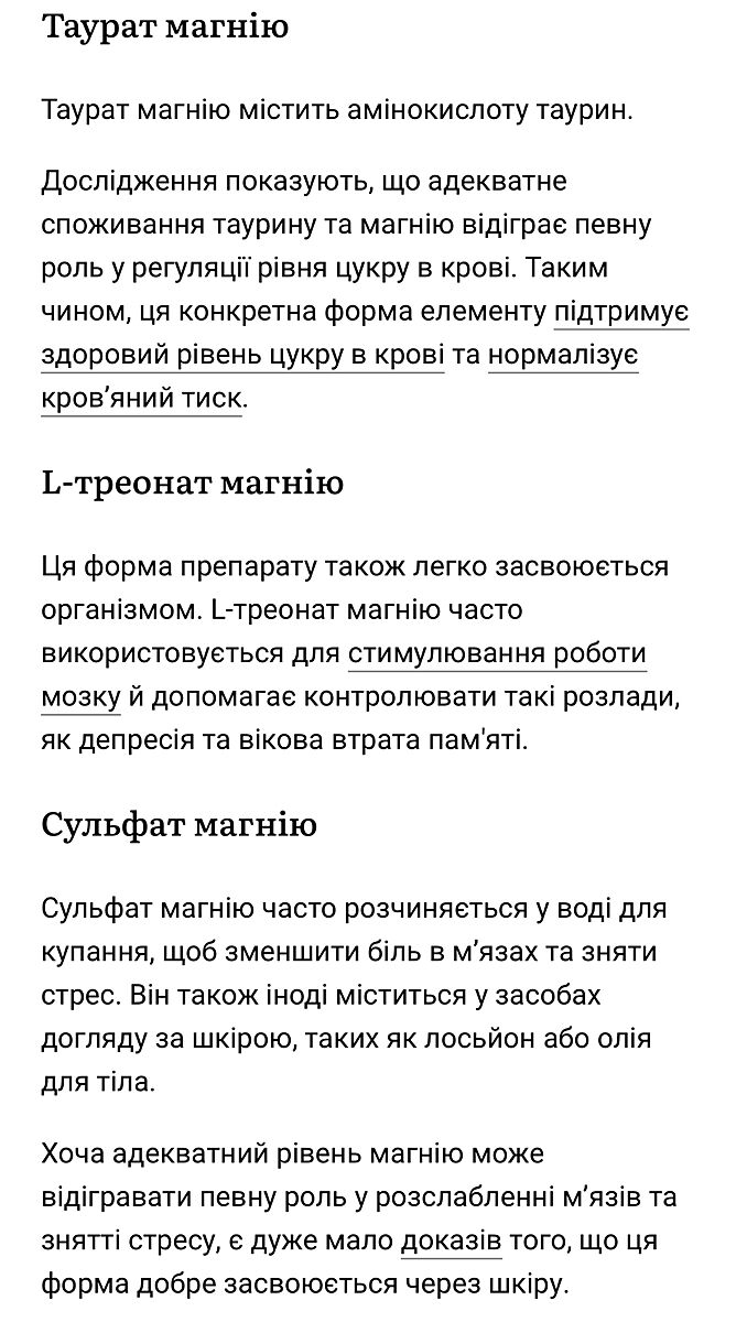 Абсолютно всі форми магнію заспокоюють. Але важлива доза, на початку дійсно бажано приймати разом з віт В. В будь-якому випадку приймати треба тривало, іноді треба поєднувати з прийомом віт Д