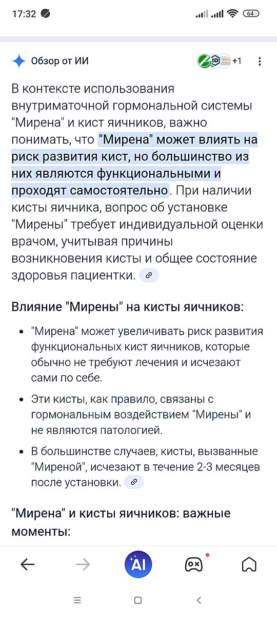 Я за границей поставила Мирену по показаниям, на первом же контрольном узи врач сказала - о, киста появилась, но это нормально, потом пройдет. Все. Ничего не гуглила, живу дальше, на след узи посмотрим
