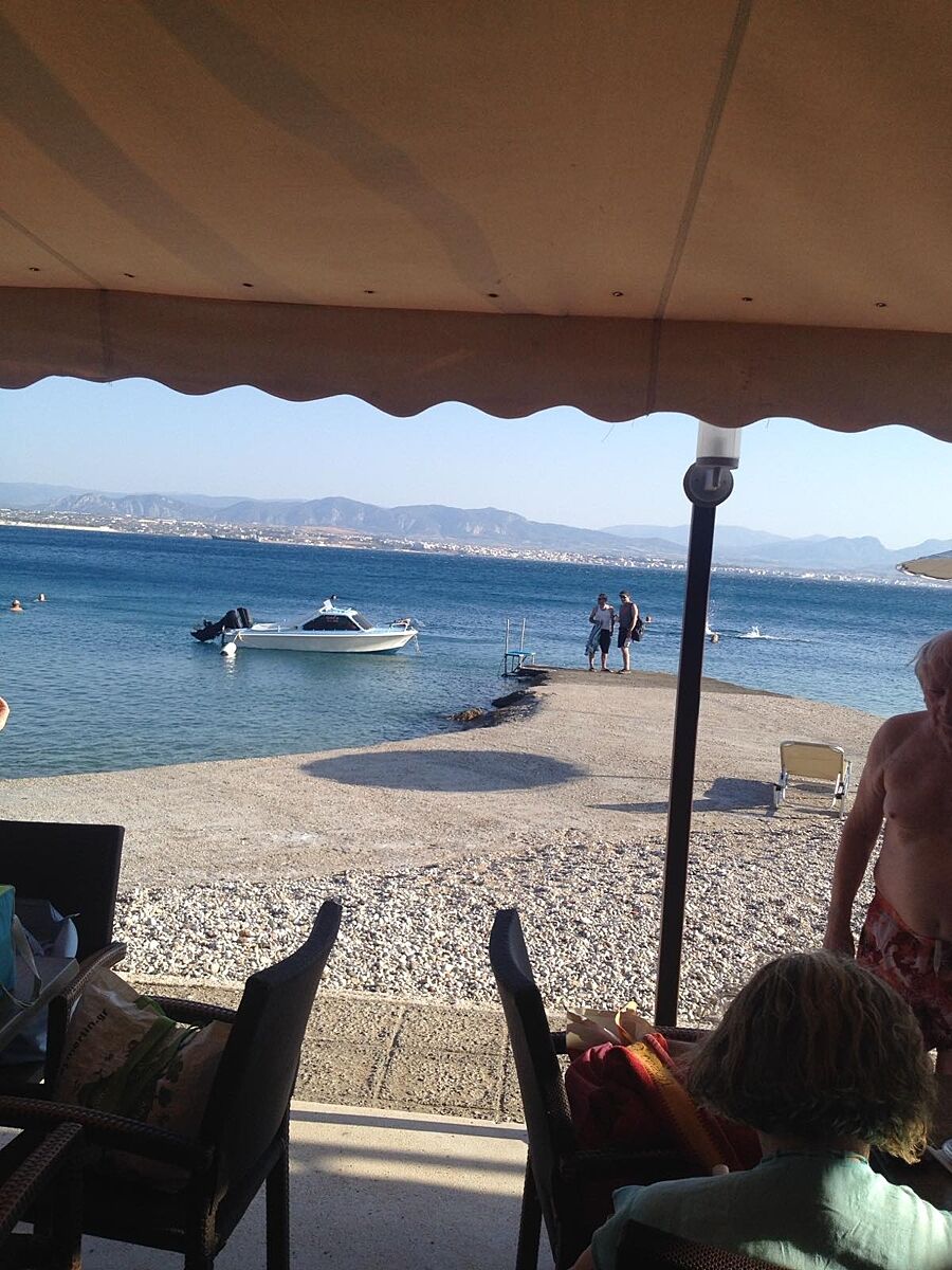 Ваш готель трохи на відшибі, основна двіжуха трохи далі. У нас з нього автобус був на екскурсію, ми за день хотіли дійти і дорогу побачити, за скільки часу потім на екскурсію вийти. Не дійшли)) Задовбалися ’прогулюватися’ по пляжу. Тому, брали таксі потім. Але саме містечко чудове, мені нагадувало таке собі совдеповське санаторне містечко))) Кафе саме у місті аігіто, є супермаркет доволі гарний. Є родонові басейни та спа.Канал гарний, можна у сусідні містечка поїхати. В Афіни можна на автобусі дешево з’їздити.