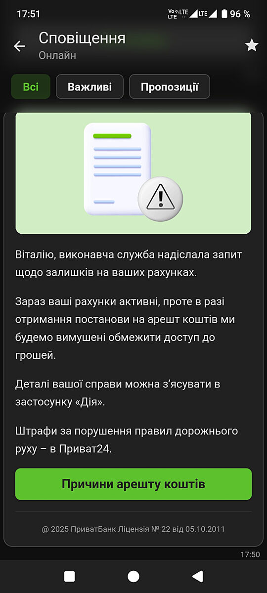 Может у кого-то было подобное. Пришло сообщение в Приват24 что виконавча служба подала запрос на остаток на счетах. На сайте Минюста висит что открыто выконавче провадженя от тцк, но сумы нету. Была повестка в прошлом году,не забирали и не ходили, резерв не ставили. Больше никаких штрафов небыло и сегодня выконавче провадженя. Чем грозит если не платить, кроме блокировки счёта?