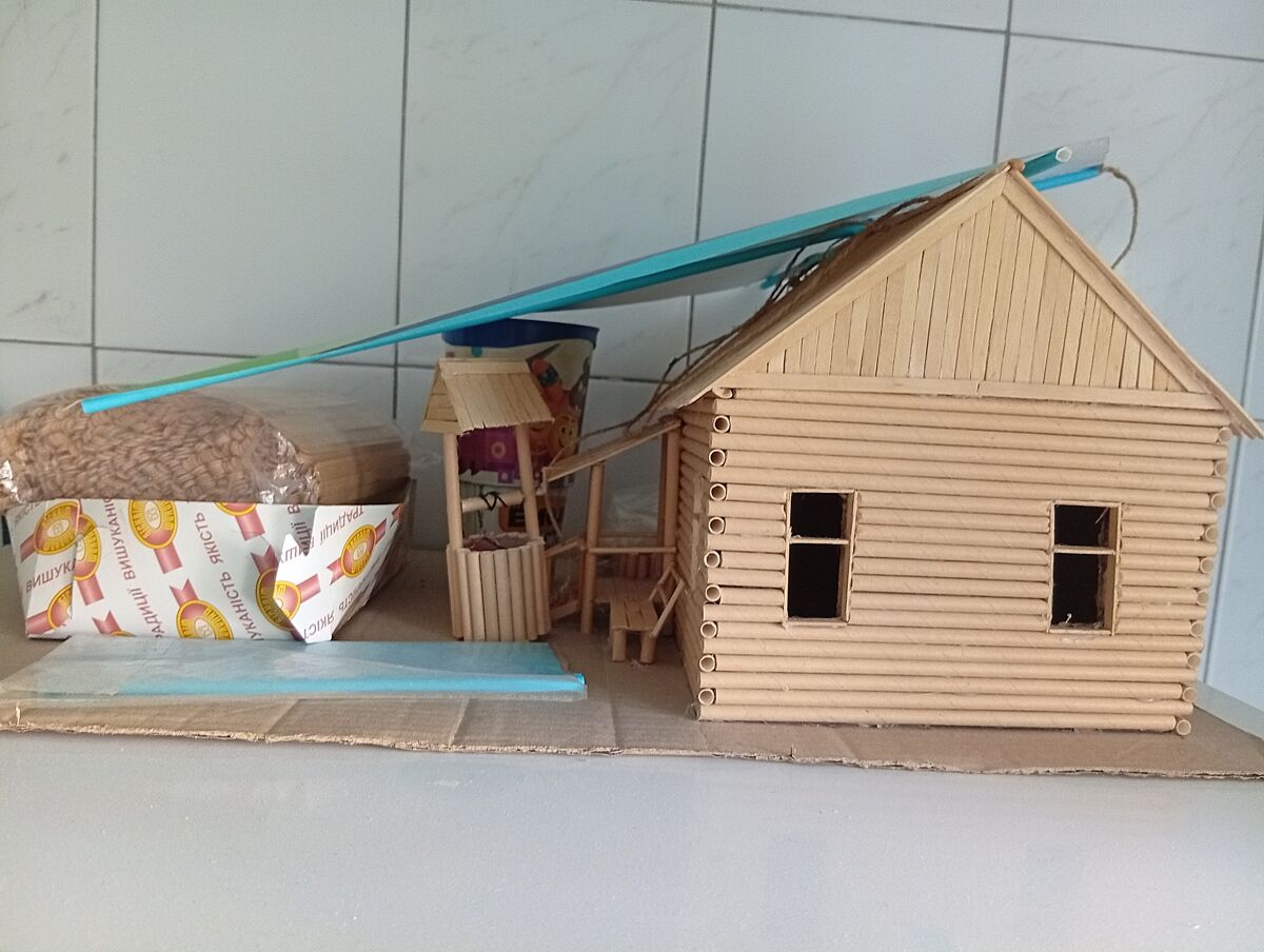 Домик из трубочек муж делает с сыном,но оооочеь медленно)