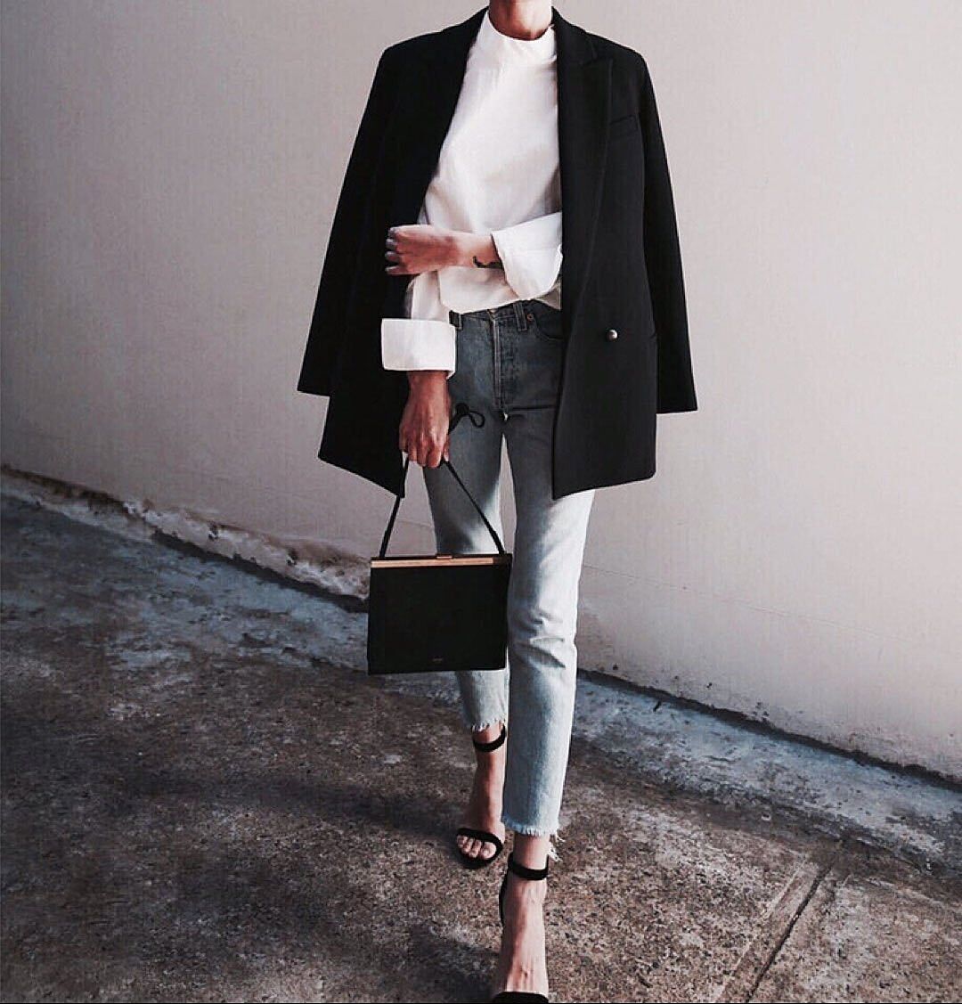 Черные и синие прямые джинсы, черные, серые, голубые свитера прямого силуета типа мужских но вашего размера и на один больше.
