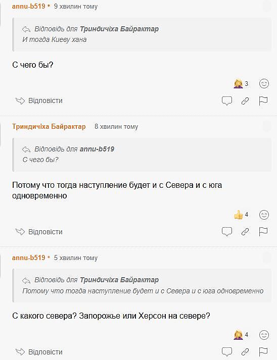 Я не военнообязанная , никого не гоню на войну, но прекрасно понимаю, что отдачей 4 областей война не закончится. Про ужасы оккупации знаю не из интернета. Нет у нас нормального выхода, раньше нужно было думать, а не теперь друг друга кусать.