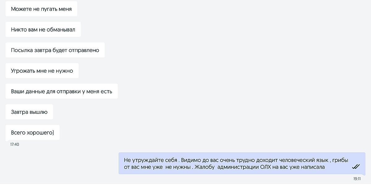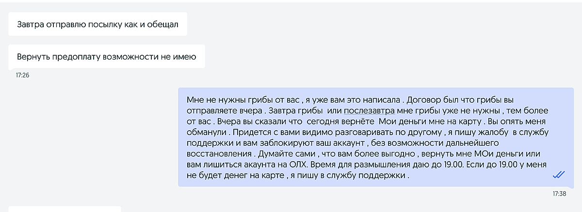 А зачем обещать? Поставь в объявлении: отправляю грибы по мере сбора, среднее время отправки: 3-4 дня. К чему эта ложь про отправку завтра, отписка, что какому-то человеку всё отправил и Автору не хватило. Деньги выслали? Выполняй обязательства.