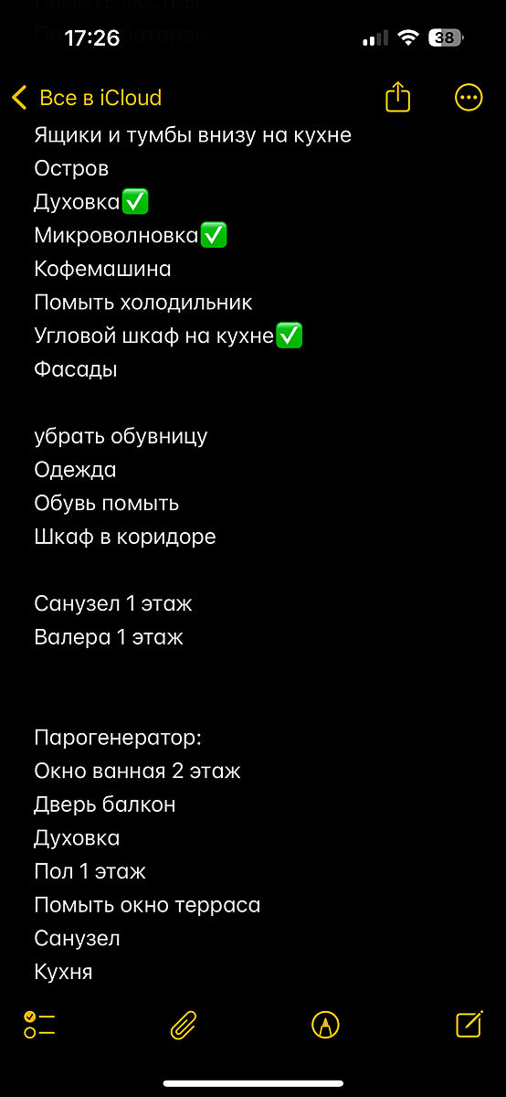 Короче, у меня в заметках есть такой список) когда планирую уборку хорошую, ставлю такой знак ❗️а когда я выполнила все ставлю ✅. Ну вот планируется у нас отпуск, а потом через пару дней лагерь у детей, вернутся они в конце августа. Я хочу до всего этого отдыха перебрать все детские вещи, что маленькое отдать, посмотреть что есть на осень, чего не хватает - докупить. У меня должно быть все структурировано и максимально эффективно