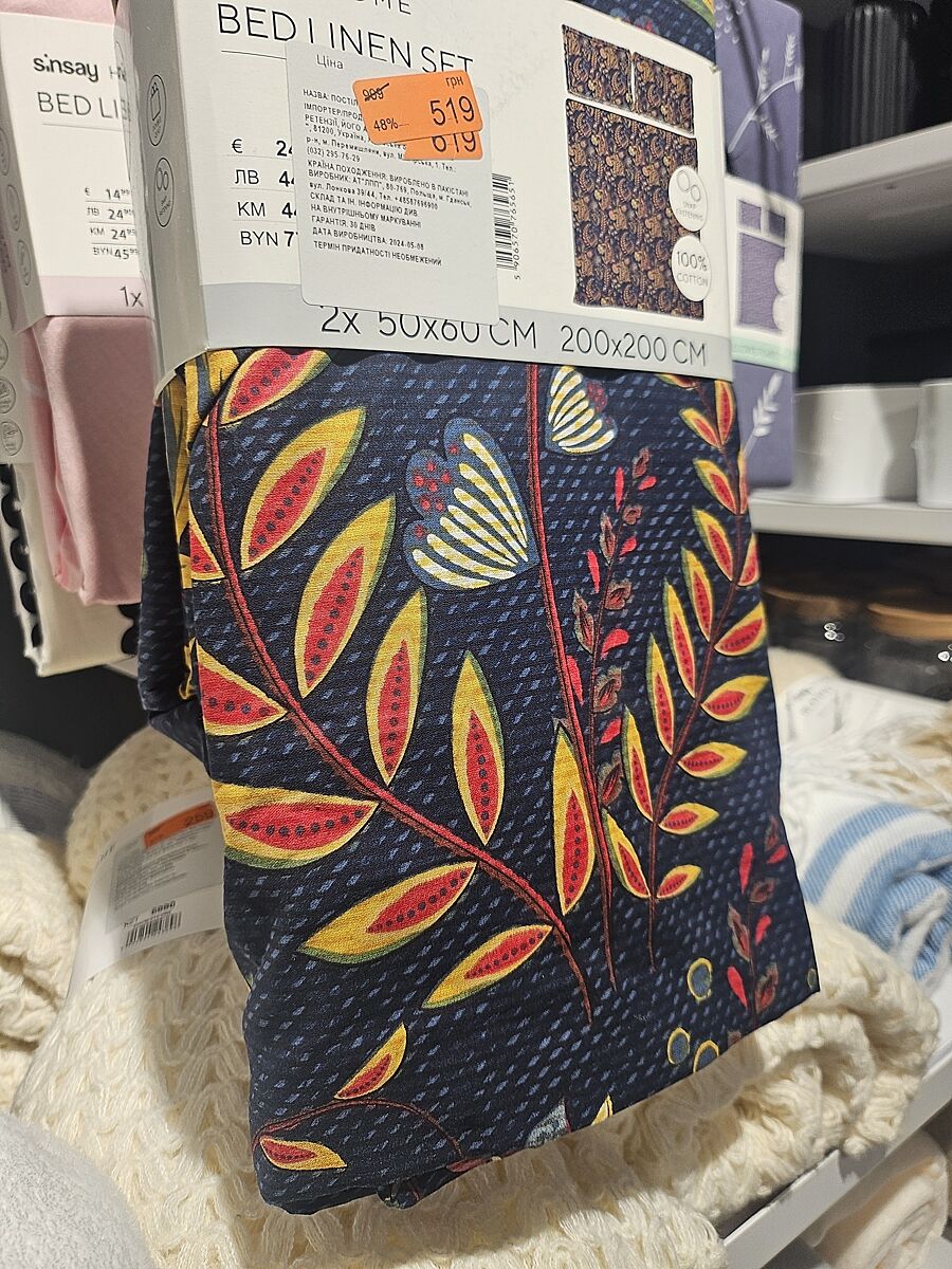 Этот комплект сейчас онлайн стоит 459, а вообще качество постели- хрень полная, простыни на резинке- тоже фуфло.