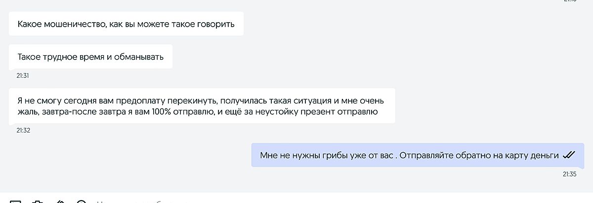 Договоренность была что после моей оплаты продавец высылает грибы на следующий день . Как сделал бы нормальный продавец если бы на следующий день не было Грибов ? « Извините, но сегодня грибы закончились . Если вас устроит, я вышлю в ближайшие дни , если вас это время не устраивает - верну вам деньги на карту». Он же мне не написал ничего в течении дня и я вечером его сама стала спрашивать , выслал он мне грибы или нет ?