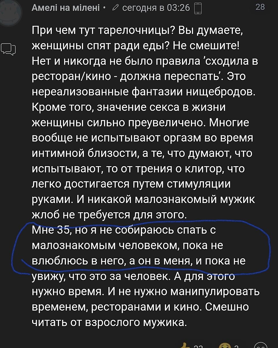 Да, я согласна с автором поста, мне нужно влюбиться в человека, узнать его, от малознакомого мужчины мне даже прикосновения неприятны , какой может быть секс