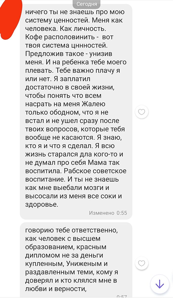 Сходила вчера на свидание , общались буквально часок , решили на кофе сходить - по внешнему виду - нормально, но я сразу поняла, что у него куча комплексов. Я спрашивала то, что меня интересует , вроде никак его не обидела - был ли женат, есть дети , платит ли алименты ( у меня тоже есть ребенок ) оказалось, что Мч не разведен и его семья в Германии , алименты он не платит потому что они перестанут получать пособие , с женой не общается вообще . Живёт в совместно купленном доме, копит на собственную квартиру . Девочки, в принципе свидание получилось спокойным, тихим , мы заказали кофе и так как я не планировала идти на второе свидание- предложила поделить счёт , его это унизило . Откровенно говоря, считаю его человеком очень мягким , добрым , но мне показалось, что он перекладывает ответственность за отношения в семье только на бывшую . В общем, что-то нужно отвечать на эту простынь ? Он ее ночью написал, видимо был пьян . Жаль человека - абсолютно сломлен что ли