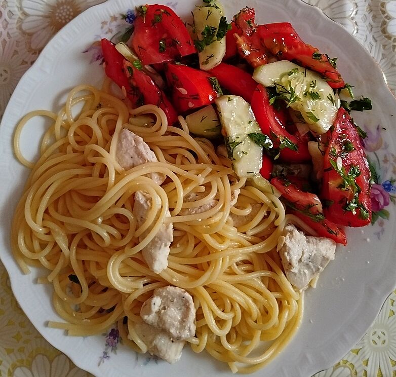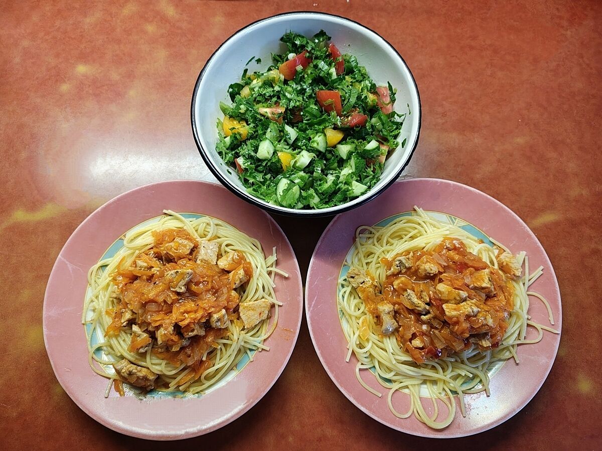 В мене теж макарони сьогодні, котлети-овочево-м´ясні, і салат Шопській.