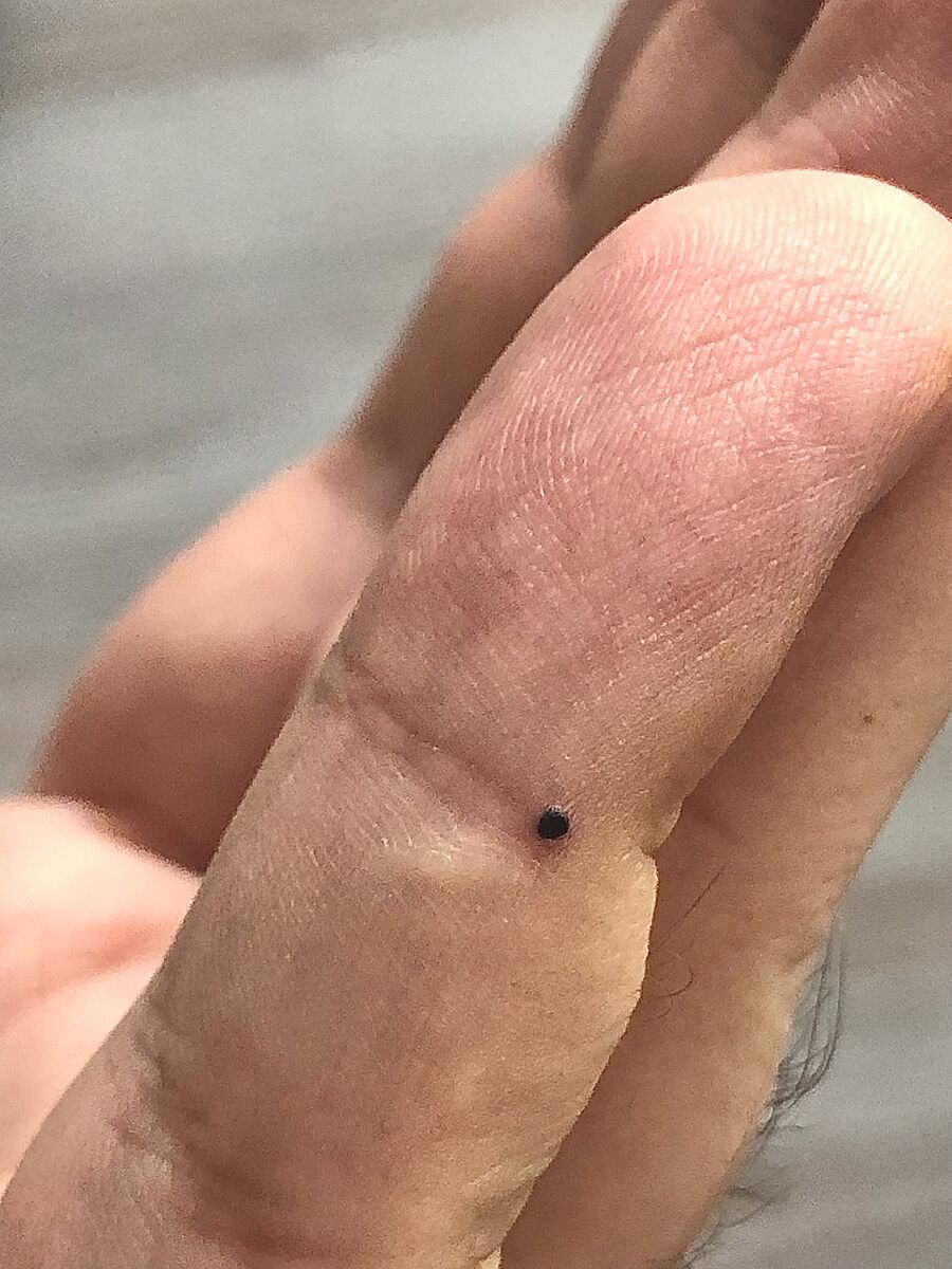 Зʼявилася в чоловіка така штука. Колір чорний з синюватим відтінком, відчувається над поверхнею шкіри, тверда, не свербить, не болить, не кровить. Каже, що пальцем не вдарявся, не коловся. Боюсь, щоб не меланома. Схоже чи не схоже?