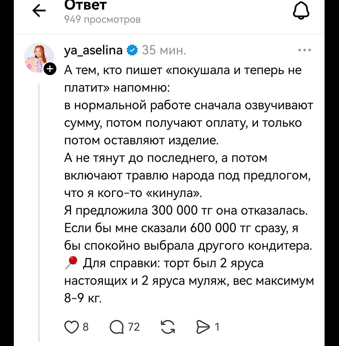 Не в курсі історії. З того шо тут прочитала як можна продавати торт, не озвучивши ціну. Як можна віддати торт ( начебто ж віддала?) без оплати??