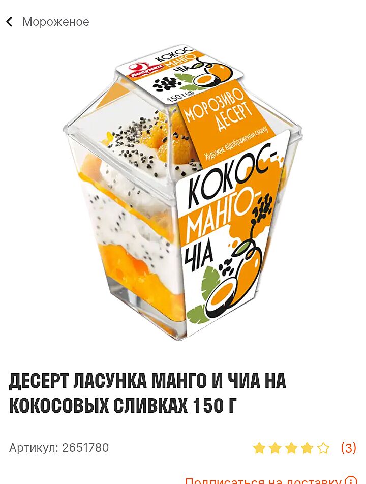 Склад: Десерт 64% (вода, вершки кокосові 25%, цукор, молоко сухе знежирене, олія кокосова рафінована дезодорована, стабілізатор (емульгатор: моно- та дигліцериди жирних кислот, стабілізатори: камедь ріжкового дерева, гуарова камедь), наповнювач ’Манго’ 34% (манго свіжоморожений 50%, цукор, стабілізатор каррагінан, регулятори кислотності: цитрат натрію, лимонна кислота, барвник каротин, ароматизатор), насіння чіа 2%