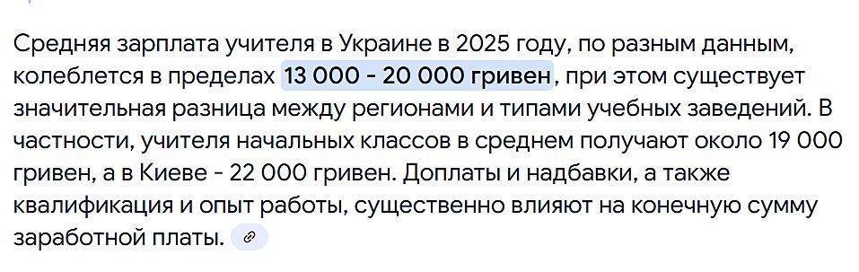 В мене знайома вчитель зарубіжної літератури, вдова з дитиною, на свою зп ледь зводила кінці з кінцями, бо вся зп в нуль йшла на зйом/харчування/одяг, а якщо хворіти, то вже розкіш. Виходить, що вчитель немає права на дитину, бо немає грошей, щоб її виростити. І чому людина, яка витратила 5 років в університеті повинна отримувати копійки? Вчительська зп повинна бути не нижче за середню.