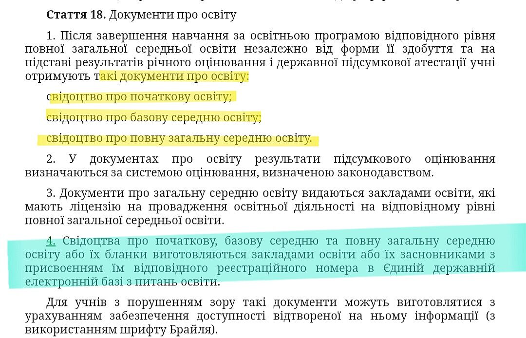 Читайте закон ’Про повну загальну середню освіту’, стаття 18 - документи про освіту: