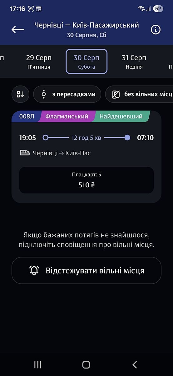 Чернівці-Київ є 5 місць в плацкарті
