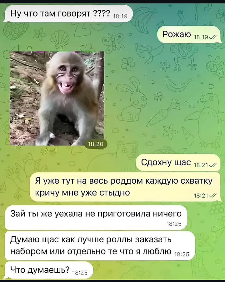 Я когда со схватками лежала , муж сидел рядом и бесил меня вопросами : хочу ли я есть , что мне купить 🙈