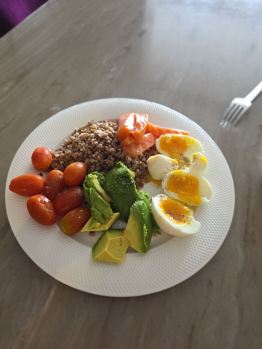 А як в вас зранку ці томати та огірки влазять. Диво. Ще й ця жирна риба. І авокадо 🤮 .