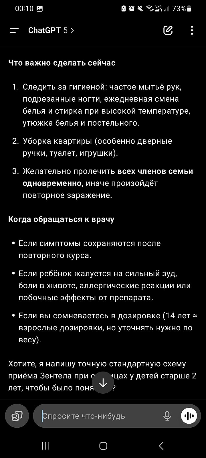 Девочки, помогите советом, кто в курсе. У дочери обнаружили острицы, вчера врач выписал зентел таблетку. Вчера она выпила, но сегодня я все равно вижу возле анального отверстия этот ужас! Что делать? У меня уже паника…