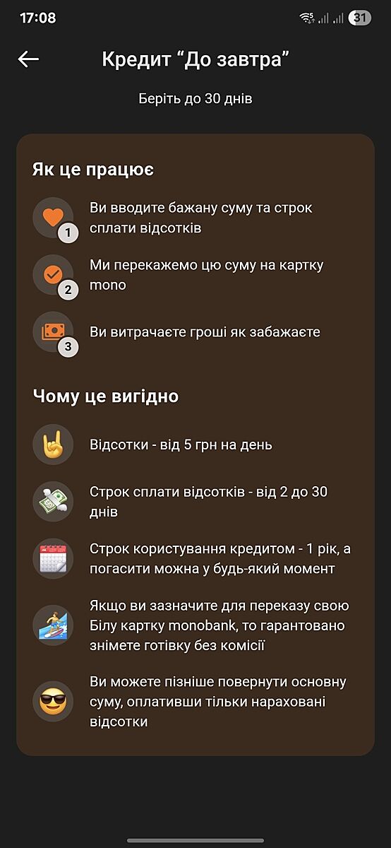 Часто беру,коли на карті 0 дуже виручає,або до прикладу якщо вам терміново треба певна сума,обираєте певну суму на кількість днів і там рахує скільки буде %грн в день і в кінці вносите суму кредиту та %