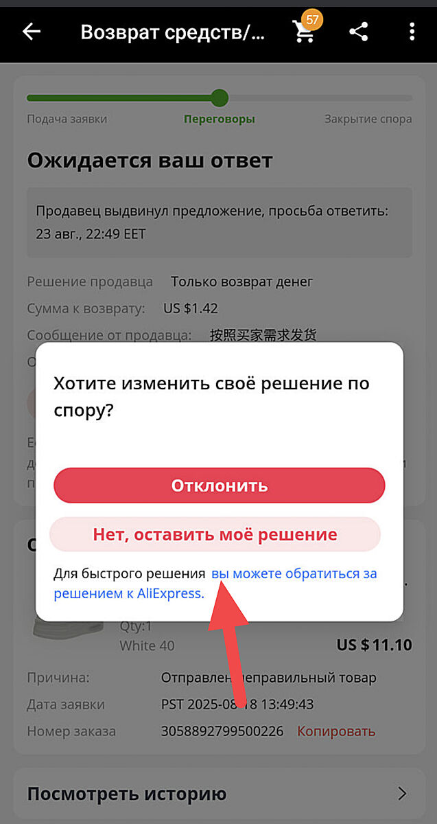 Подскажите пожалуйста,мне сначала показывало выбор принять или отклонить предложение продавца. Я ниже нажала( фото со стрелкой куда нажала) и теперь этот выбор пропал и показывает вот так( второе фото,что теперь АлиЭкспресс решает этот вопрос). Что дальше делать?