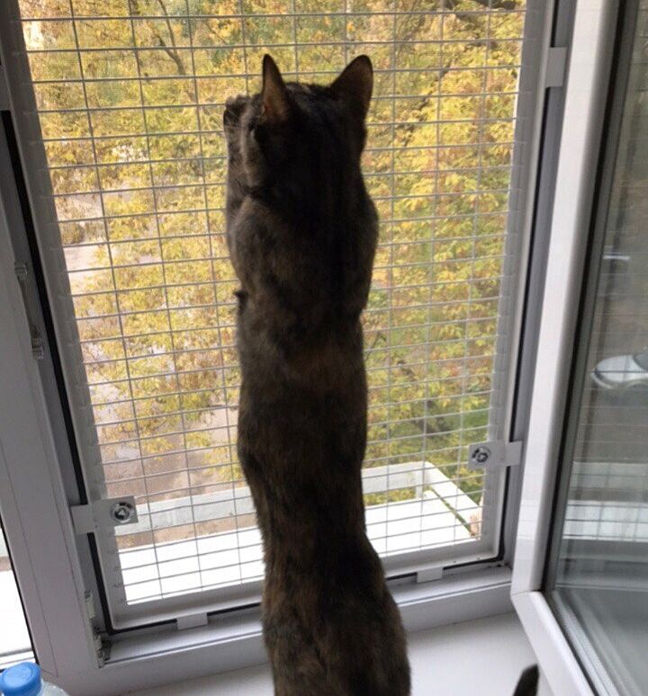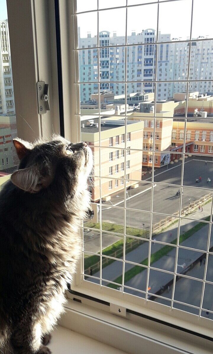 Чтобы кот не выпал, это должна быть прочная сварная металлическая решетка. Типа как на фото.