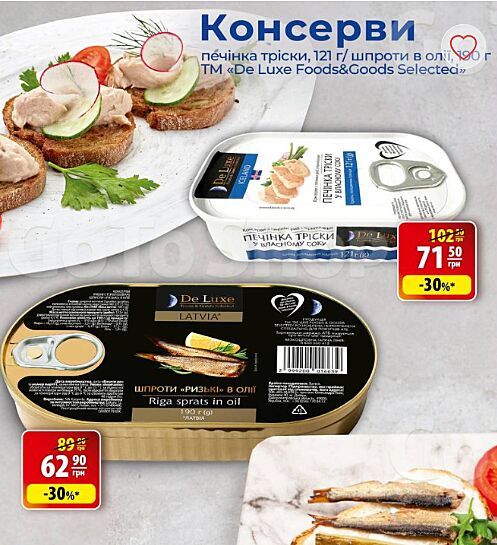 Консерви печінка тріски, 121 г/ шпроти в олії, 190 г TM «De Luxe Foods&Goods Selected в АТБ по 71,52 та 62,90 відповідно. Смачні і по гарній ціні. А якщо є кешбек, то ще на 10% дешевше війдуть. До того ж термін придатності таких консерв до 5 років, тож. можна взяти прозапас враховуючи ріст цін.