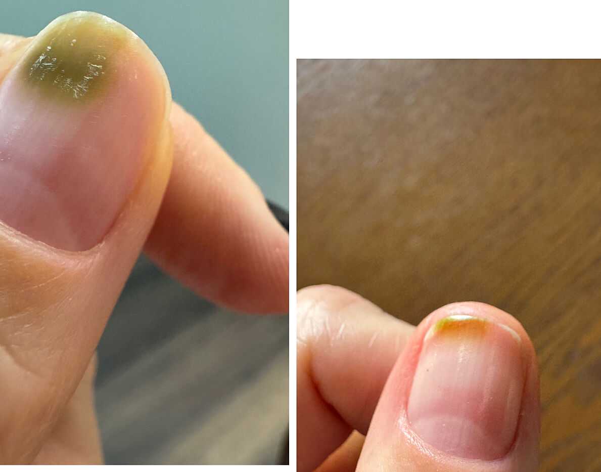 А у меня псевдомония на одном ногте первый раз в жизни. Но уже отрастает, разница между фото 3 недели. Сняла покрытие