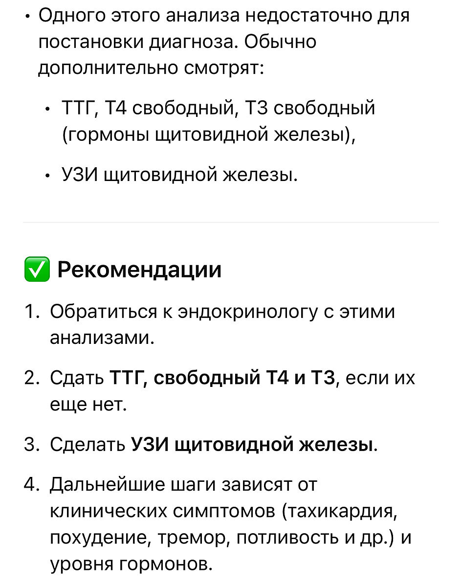 антитела означают воспаление органа даже при норме , в щитовидке не разбираюсь но когда антитела в печени это означает гепатит , воспаление и выделение антител - их не должно быть вообще ,кроме анализа нужно дополнительные обследования вам написали выше узи обязательно для уточнения размеров органа и есть ли показания к операции по удалению органа например киста , узи тоже не показатель диагноза КТ тоже делают и несколько видов анализов разных крови и мочи , у моей родственницы удалили щитовидку еще в молодости из за того что она теряла зрение потом всю жизнь жила на гармонах , долго уже ее нет давно , до войны еще умерла от язвы желудка