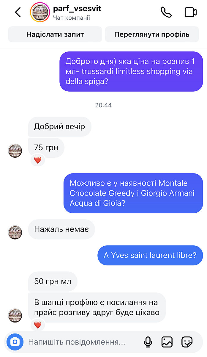 До вашої уваги - магазин парфумів на розпив. Складається враження, ніби я сама повинна напрошуватися зробити в них замовлення