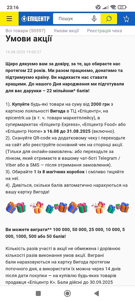 Я в Епіцентрі виграла в 2021 році 30000 балів. Була акція така, я виграла 50% від суми чеку. Тоді робився ремонт в квартирі, тому чек був на велику суму.