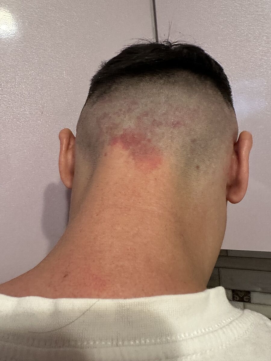 Звичайне родима пляма. В мене у всіх родичів є такі, але вини не голяться налисо. Якщо б усіх постригти так, то такі ж самі були б