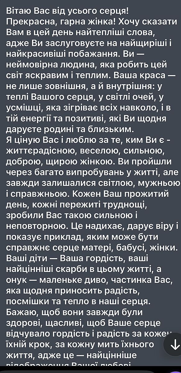 Отношение у нас плохие, я её не люблю. Я считаю, что сын достоин большего. Она об этом прекрасно знает и её родители, что к этой девушке тепла я не испытываю, но она всегда, каждый год поздравляет меня с днем рождения красивыми, долгими текстами з поздравлениями. Даже мне приятно, но мне кажется пахнет двуличием с её стороны, почитайте отрывок поздравления поймете.