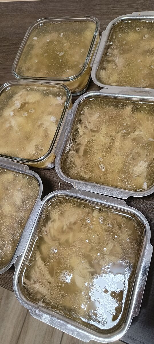 Після закипання і появи піни злийте воду і промийте добре мʼясо. Додайте моркву і цибулю, але не чищену, тільки верхній слой шкаралупи зніміть, добре промийте і так кладіть — шкірка дасть золотистий колір. Не соліть. Варіть на дуже повільному вогні без кришки. Піну знімайте. Коли мʼясо буде готове, додайте часник, лаврушку, перець горошком, хай ше хв 15 повариться. Желатін давайте, якщо кісточки немає. Як є, то не треба, так застигне. Потім витягніть і розберіть мʼясо, а бульйон відцідіть на марлю чи дрібне сито. Потім той бульфон в кастрюлі чистій хай всядеться хвилин 5 і зверху покладіть на рідину паперову серветку, і так 3 рази — це зніме жир. Ну і далі секрет такий, що розливати вже в холодильнику: спочатку рідину, а потім красиво мʼясо. Зірочки там ще можна повирізати з моркви, листочки петрушки покласти, як особо упоротися, то й кружелятко перепелиного яєчка. І буде краса )