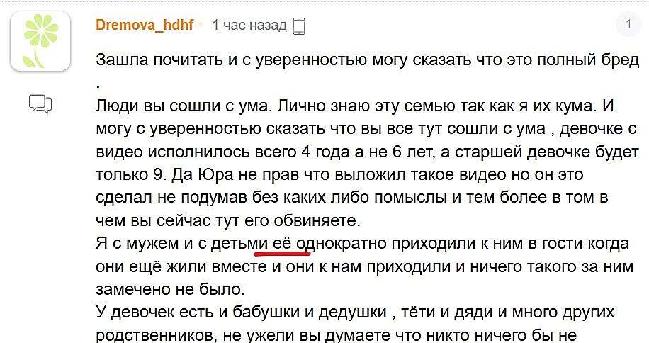 Люди вы сошли с ума. Лично знаю эту семью так как я их кума. И могу с уверенностью сказать что вы все тут сошли с ума , девочке с видео исполнилось всего 4 года а не 6 лет, а старшей девочке будет только 9. Да Юра не прав что выложил такое видео но он это сделал не подумав без каких либо помыслы и тем более в том в чем вы сейчас тут его обвиняете.