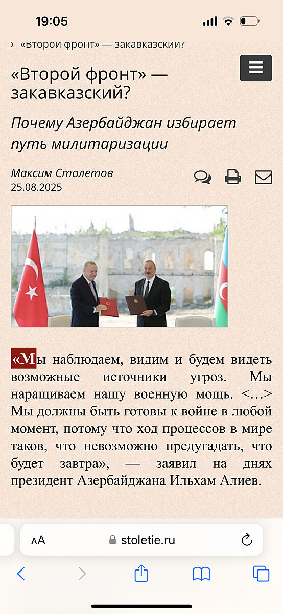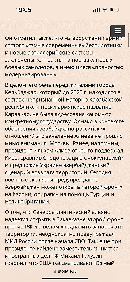 Вкратце-Алиев заявил,что он готов к войне.Дерутаты азербайджанские обозвали идущих 4 года на Киев за 3 дня «сборище тюремных преступников», от них останутся «одни ошметки» если русня рыпнется на Баку.Кацапы пишут,что Алиев лег под Турцию ,США и Европу и с Баку останется пепел за это и что Алиев дает сейчас Украине 2 мил дол и раньше давал,а Запад и США снабжают Азербайжан дронами и ракетамиhttps://www.stoletie.ru/tekuschiiy_moment/vtoroj_front__zakavkazskij_666.htm