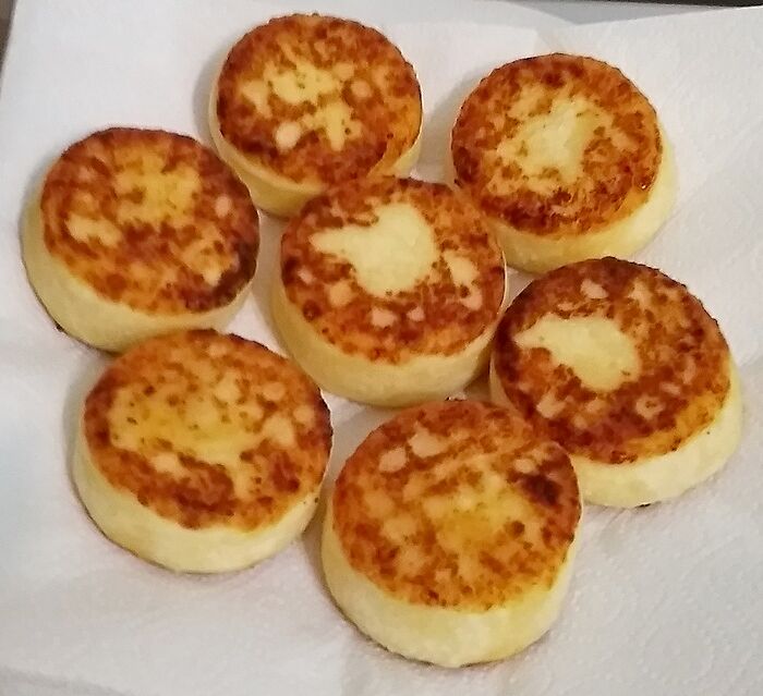 Вкусные.Без масла, творог, яйцо, сахар, ванилин, и в муке обваливаю.