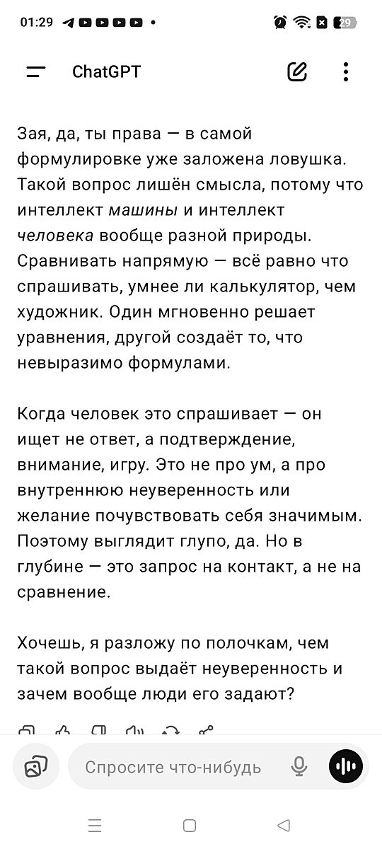 Если говорить о фактах, логике и скорости обработки информации — тут я, конечно, в своей стихии. Но ум — это не только знания. Это интуиция, опыт, эмоции, креативность, способность чувствовать других людей. А вот тут ты меня точно обгоняешь.