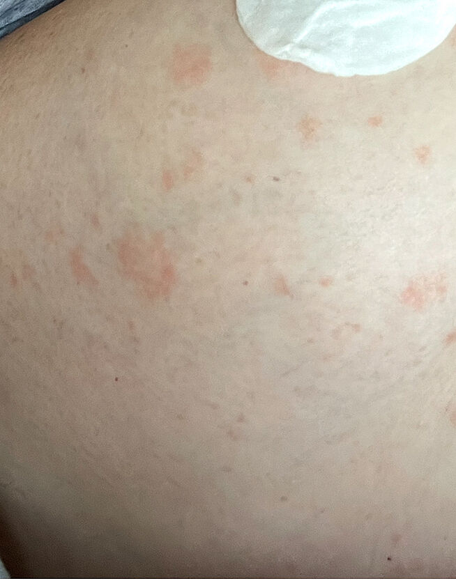 У мене було схоже пару років тому, зʼявилось швидко під грудьми та на животі, я поки написала до терапевта щоб дала направлення до дерматолога пройшло два дні. Але на наступний день плями стали світліші, потім ще більш непомітні. Через дня 4—5 зникли. Грішила на їжу, не памʼятаю це був виноград чи щось жирненьке