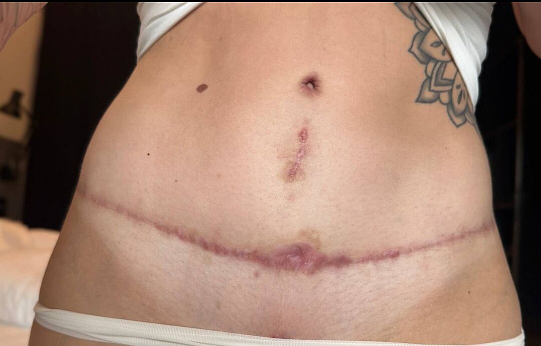 Задолбал он меня, нормальную одежду не подобрать, ещё шов от кесарево немного вниз идёт,кривоват..