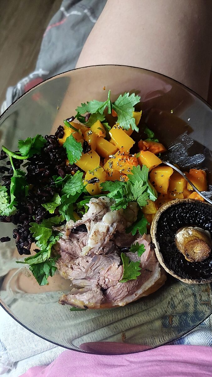 Черный рис, чиа, кинза, остальное все запеченое, тыква, баранина, грибы.