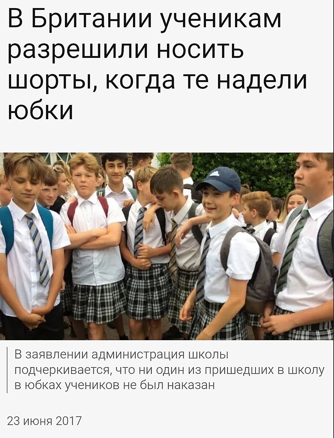 Нєєєє, ну то ж Британія, там спідниці для чоловіків окрема історія. І дивно, що в них була заборона на шорти. Навіть в шкільних розділах M&S, Next, George є шкільні шорти для хлопчиків. Принаймні раніше були, мій хлопчик вже дорослий, то я давно не цікавилась тією темою