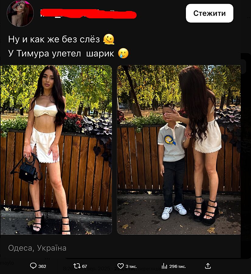 В трендсах піднявся хай через цю світлину, багатьох обурило, як ця дівчина одяглася на перший дзвоник свого сина, пишуть усіляке, в дусі, що це образ, як на панель, а не на лінійку. А інші, навпаки, стали на захист. Вважають, що це образ вільної та сміливої жінки, без тарганів в голові. Мовляв, годі обмежувати себе, щоб відповідати чиїмось очікуванням і бути непримітною сірою мишою, яка живе в обмеженнях, утискаючи себе якимись вигаданими правилами та нормами.