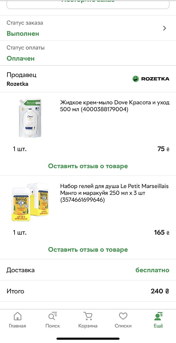 Ну вот другой заказ . Первый скрин корм и чай стоимость более 700 грн едет с одного склада , а мыльно- рыльное за 240 едет с другого склада тоже бесплатно, потому что часть общего заказа.