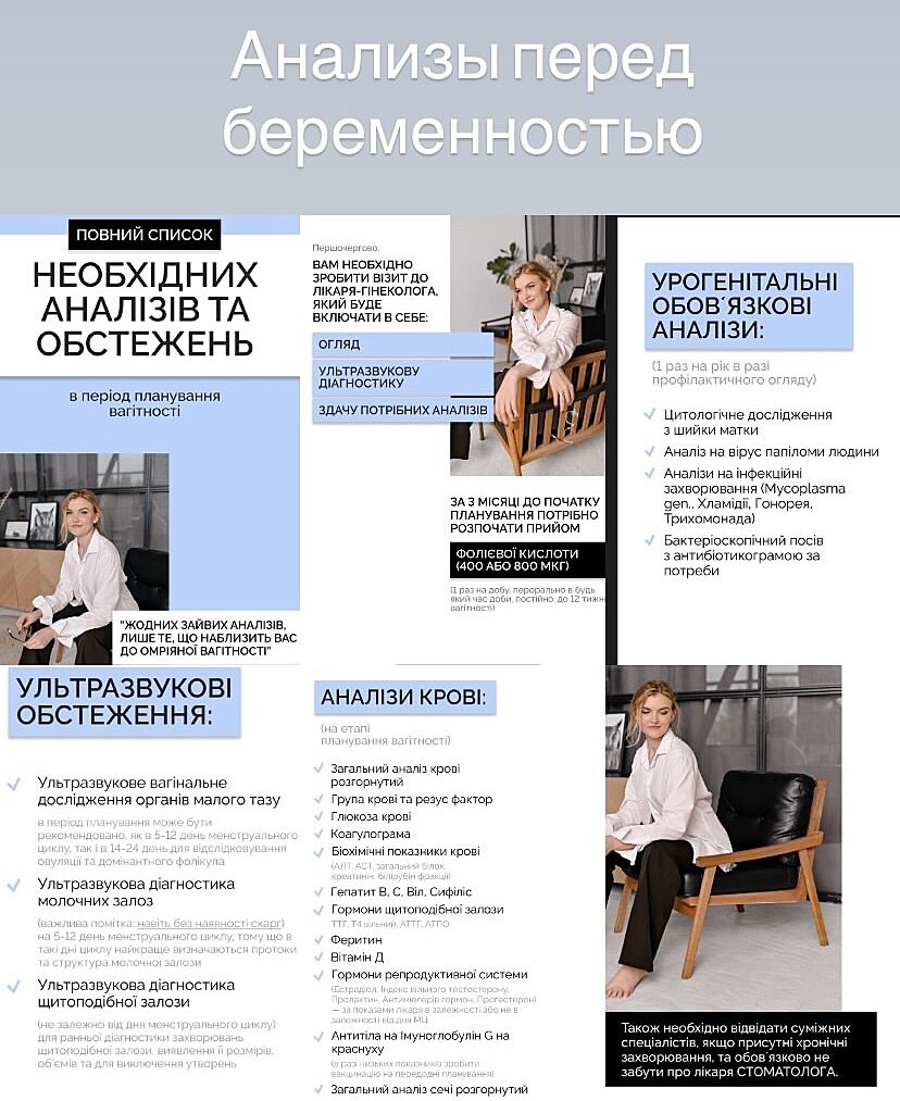 Обратитесь к генетику. Хотя бы избежите генетических поломок. Потом к репродуктологу или гинекологу. Мы делали ЭКО по госпрограме, то там такой был перечень анализов, что обычная женская консультация отдыхала. Можете на сайте любой репродуктивной клиники ознакомится с этими анализами.