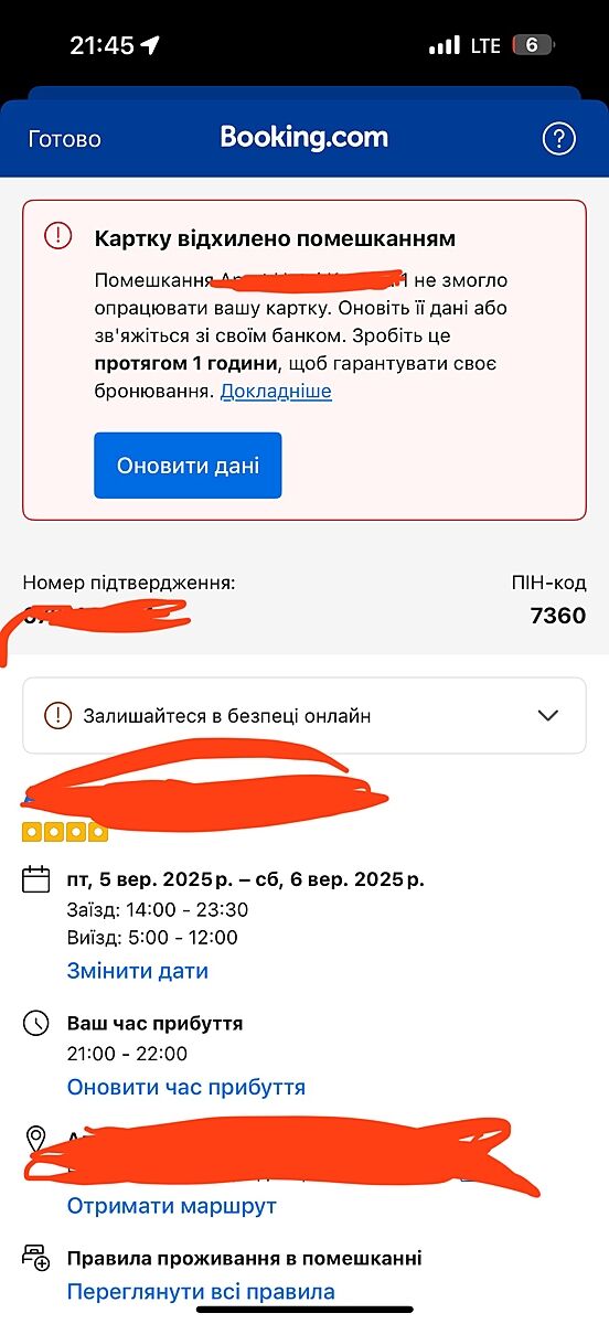 Так ось схвалено. Ми заселились і через годину прийшло ще одне повідомлення, що дані карті недійсні, хоча сума знята) я ще з такими схемами не знайома.