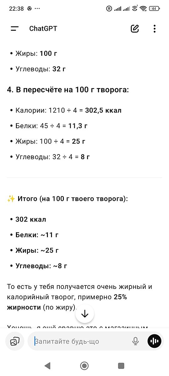 Чат GPT рассчитывает жирность общую на кг, и когда отделяется сыворотка, то почти вся жирность остаётся в твороге.